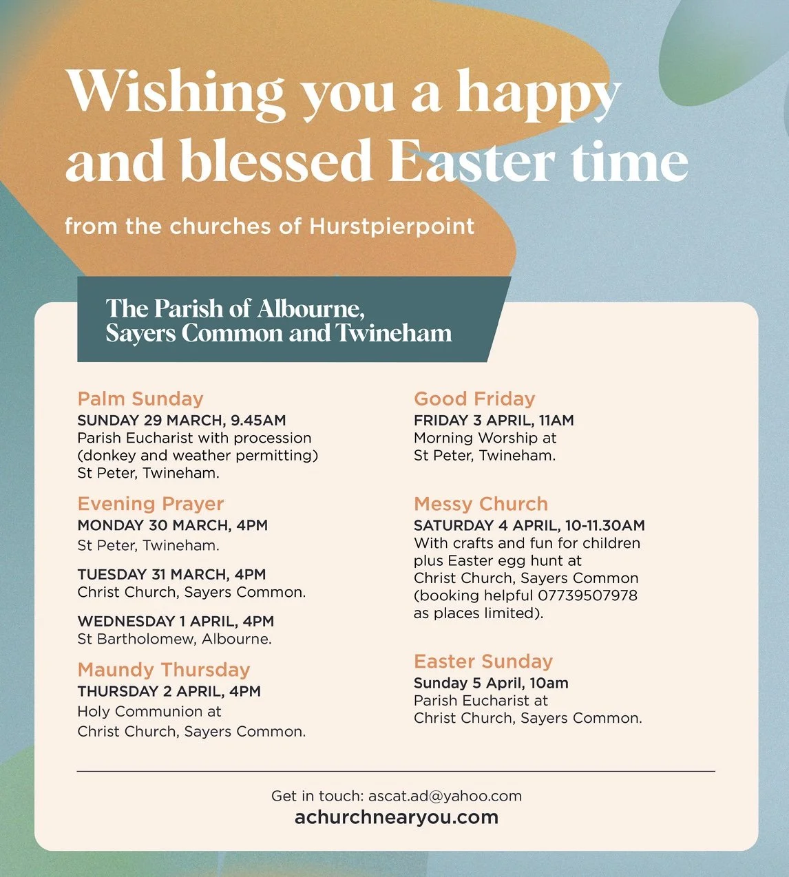 Saturday 4th April from 10-11.30am with crafts and fun for children plus Easter egg hunt at Christ Church, Sayers Common (booking helpful 07739507978 as places limited).